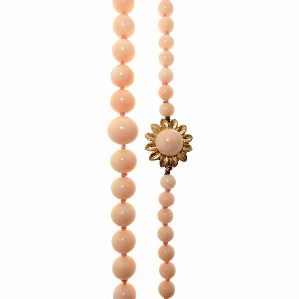 MATERIALE: oro giallo e corallo pelle d'angelo DESCRIZIONE: collana in sfere in corallo rosa degradè con fermezza a fiore impreziosita da corallo rosa taglio cabochon MISURE: lung. cm 30 PESO: gr 54,3