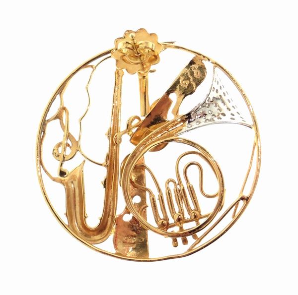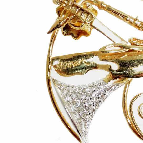 MATERIALE: oro giallo, oro bianco e diamanti DESCRIZIONE: paio di orecchini pendenti, ciascuno di forma circolare con al centro teoria di strumenti musicali con dettagli impreziosoiti da diamanti taglio brillante, esemplare numero 8, corredato di autentica rilasciata dall'autore su fotografia, firmati MISURA: lung. cm 5 PESO: gr 32,6