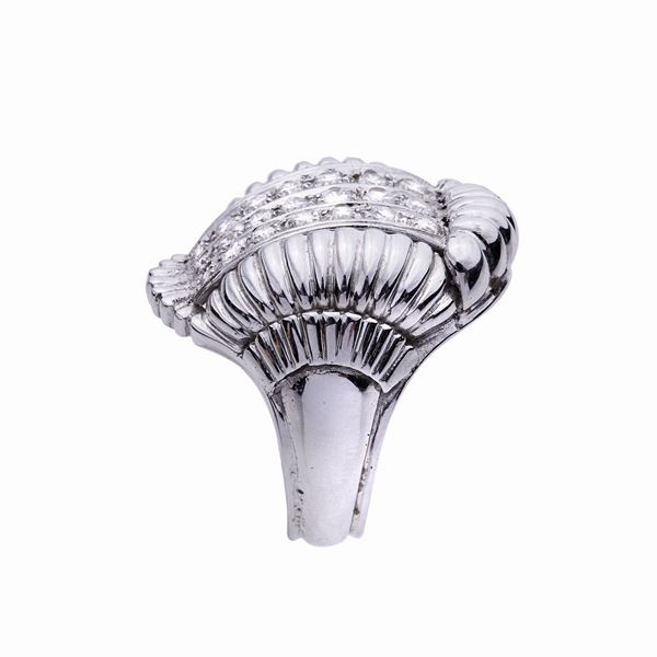 MATERIALE: oro bianco e diamanti DESCRIZIONE: anello con al centro diamanti taglio brillante disposti in tre file che poggiano su base baccellata MISURE: 12 PESO: gr 15,9