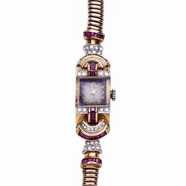 MATERIALE: oro giallo, oro bianco, diamanti e rubini DESCRIZIONE: bracciale orologio, quadrante quadrato con numeri arabi, carica manuale, impreziosito da diamanti taglio vecchio e rubini taglio carrè disposti a semicerchio alternati a diamanti, cinturino a maglia tubogas, reca il marchio 18 kt, lievissimi difetti, da revisionare MISURE: aperto cm 6,5 PESO: diamanti ct 0,50, gr 30,0