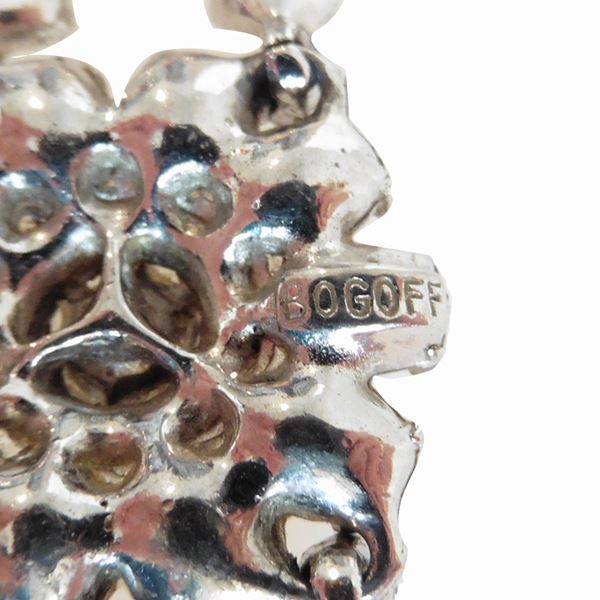 MATERIALE: metallo argentato, strass bianchi e vetro color porpora DESCRIZIONE: collana impreziosita con strass, con pendente a forma di fiore decorato con strass bianchi e pietra color porpora, firmata BOGOFF MISURE: lung collana 45 cm, pendente h 4 cm x 2.5 cm