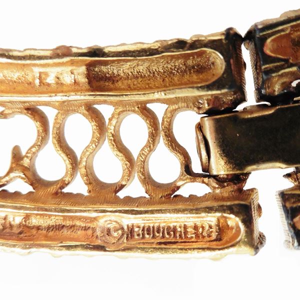 MATERIALE: metallo dorato e perle DESCRIZIONE: girocollo rigido realizzato come un nastro impreziosito da due file di piccole perle, firmato BOUCHER, reca il numero 8428N, misura regolabile MISURE: diam int cm 12
