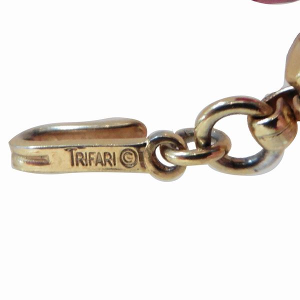 MATERIALE: metallo dorato, plastica rossa e strass DESCRIZIONE: girocollo realizzato come un filo di perle alternate a strass e con perle sfaccettate pendenti, firmato TRIFARI MISURE: lung cm 38