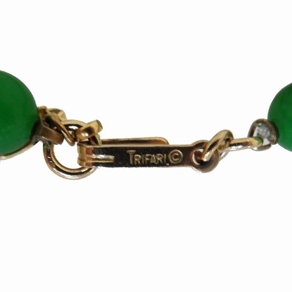 MATERIALE: metallo dorato e plastica verde DESCRIZIONE: set composto da collana realizzata in perle verdi alternate a con pendenti a goccia in metallo dorato, bracciale en suite, firmato TRIFARI, lievi difetti MISURE: lung collana 41 cm, lung bracciale 18 cm