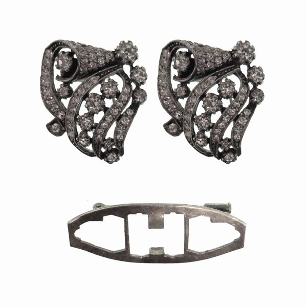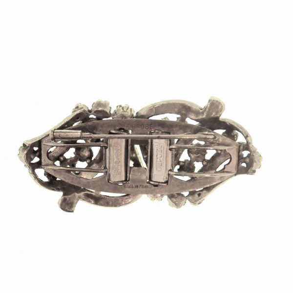 MATERIALE: metallo e strass DESCRIZIONE: spilla di ispirazione floreale impreziosita da strass, divisibile in due clip, reca il marchio DEPOSE', uno strass mancante MISURE: lung cm 6