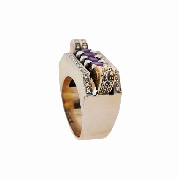 MATERIALE: in oro rosa, rubini e diamanti DESCRIZIONE: anello a ponte con riccioli ai lati, realizzato con al centro quattro rubini taglio ovale impreziositi da due fasce con brillanti taglio vecchio MISURA: 16 PESO: rubini ct 2,50, gr 14,0