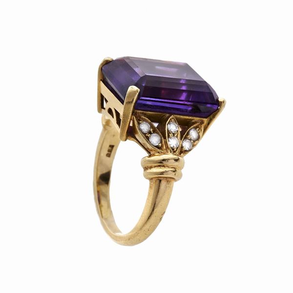 MATERIALE: oro giallo, diamanti e ametista DESCRIZIONE:anello realizzato con una ametista taglio smeraldo impreziosita ai lati da piccole foglie illuminate con brillanti MISURE: 12 PESO: ametista ct 10,0 circa, diamanti ct 0,50, gr 11,7