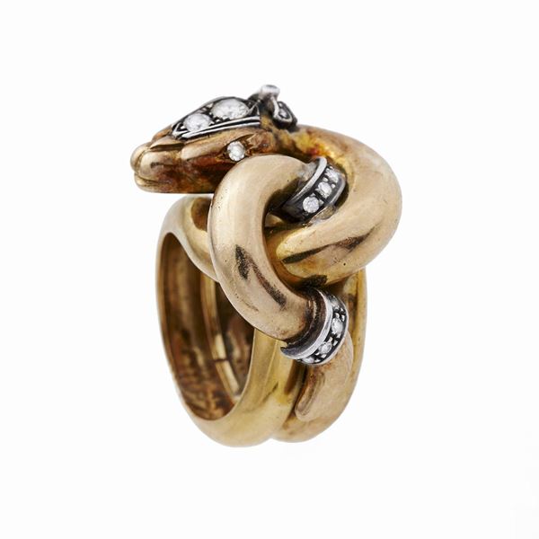 MATERIALE: in oro giallo, oro bianco e diamanti DESCRIZIONE: anello realizzato come un serpente intrecciato impreziosito sulla testa e sulla coda da diamanti taglio vecchio MISURA: 15 PESO: diamanti ct 0,30, gr 24,2