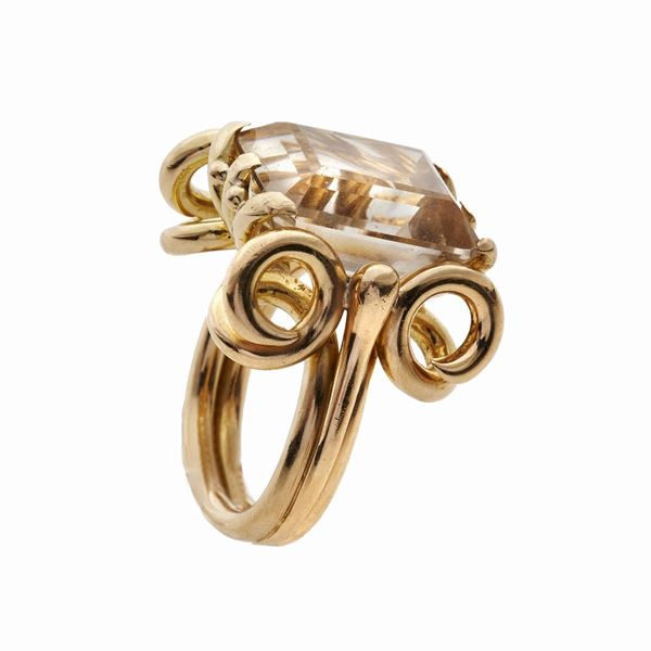 MATERIALE: oro giallo e quarzo giallo DESCRIZIONE:anello realizzato con un quarzo taglio smeraldo incorniciato da nastri stilizzati a formare dei riccioli laterali MISURE: 8 PESO: gr 19,8