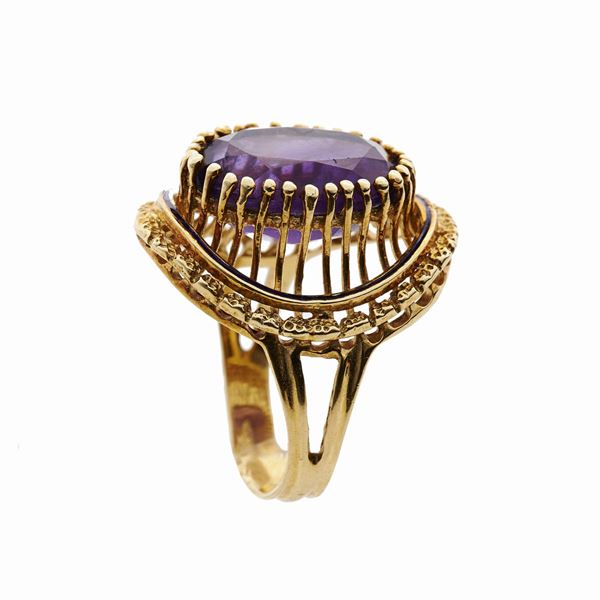 MATERIALE: oro giallo e ametista DESCRIZIONE: anello con al centro ametista taglio cuscino poggiata su alta base realizzata a piccoli fili barrette in oro, fascia in smalto blu incorniciata da un'altra fascia a piccoli motivi floreali incisi MISURE: 11 PESO: gr 6,5