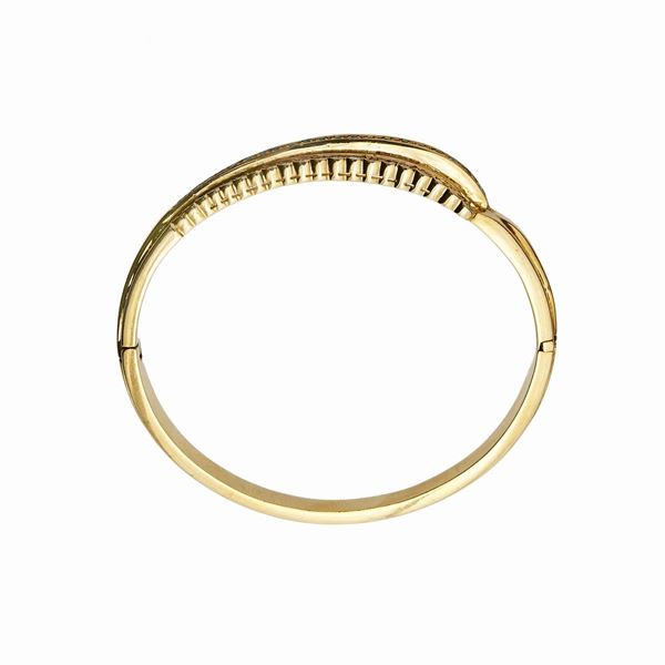 MATERIALE: oro giallo, diamanti e smeraldi DESCRIZIONE:bracciale rigido impreziosito al centro da due file di diamanti taglio brillante tra una fascia impreziosita da smeraldi, firmato Marco Fontana, reca il marchio 750 MISURE: diam int. cm ,8 PESO: diamanti ct 1,50, gr 38,6