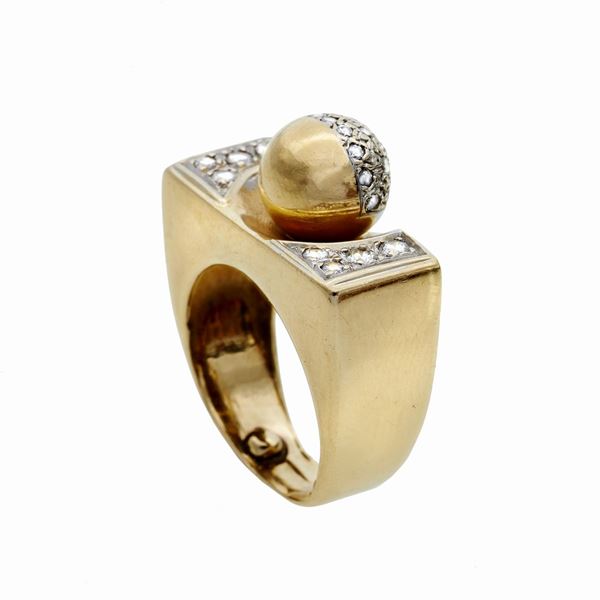 MATERIALE: oro giallo, oro bianco e diamanti DESCRIZIONE: anello a ponte realizzato con sfera centrale in parte impreziosita da diamanti taglio brillante, ai lati pavè di diamanti taglio brillante, firmato Hallo-Joy, reca il marchio 750 MISURA: 12 PESO: gr 12,0