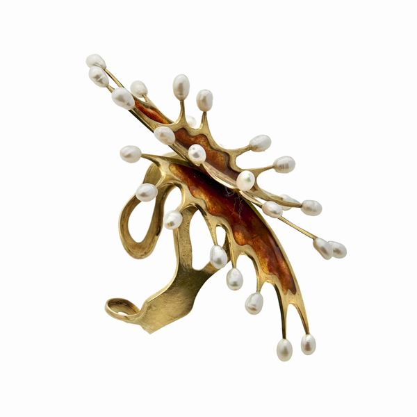 AUTORE: Anna Bini MATERIALE: oro giallo, perle coltivate e smalti rossi DESCRIZIONE: alto bracciale semi rigido che ricorda due grandi ali impreziosite da smalti e con perle finali, reca il marchio 750 MISURA: diam cm 6 PESO: gr 46,0 PEZZO UNICO