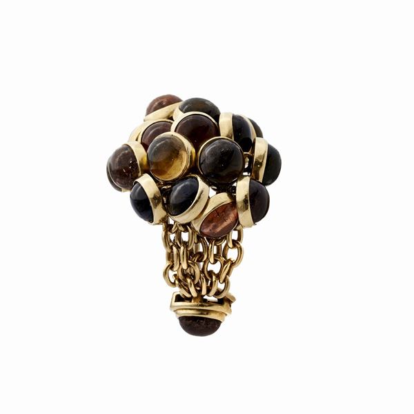 MATERIALE: oro giallo e quarzi colorati DESCRIZIONE: anello realizzato con maglia a rete intermante impreziosita da quarzi colorati taglio cabochon entro castoni circolari MISURE: 17 PESO; gr 34,2