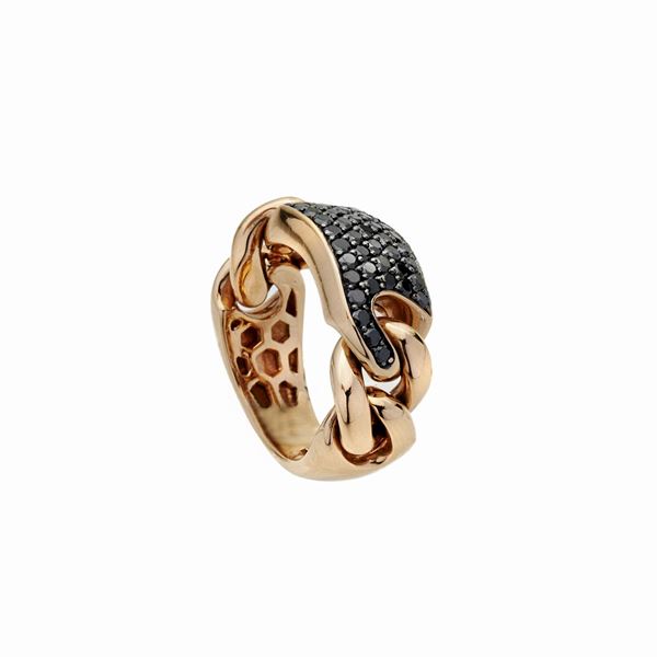 MATERIALE: oro rosa e diamanti neri DESCRIZIONE: anello con al centro placca rettangolare impreziosita con diamanti neri taglio brillante, ai lati maglie a barbazzale, reca il marchio 750 MISURE: 13,5 PESO: ct 1,20, gr 17,50