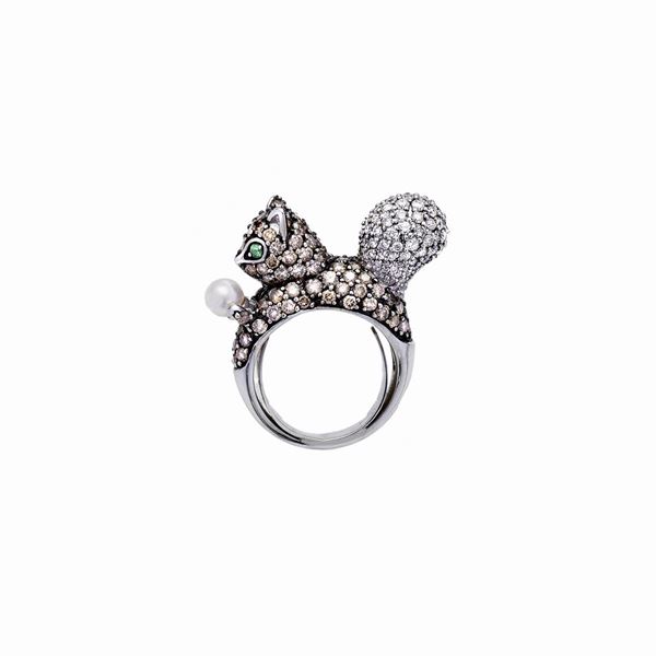 MATERIALE: oro bianco, perla, diamanti brown, diamanti, smeraldi DESCRIZIONE: anello realizzato come uno scoiattolo, occhi di smeraldi, corpo impreziosito da diamanti brown taglio brillante, coda abbellita con diamanti taglio brillante, perla incastonata fra le zampine MISURE: 7 PESO: ct brown 2,50, ct 2,0, gr 13,4