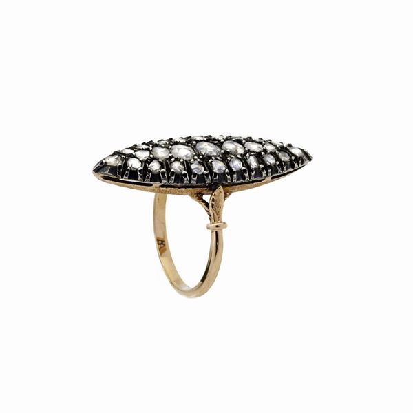 MATERIALE: oro giallo, argento, diamanti DESCRIZIONE: anello a losanga, impreziosito da rose di diamante MISURE: 15 PESO: diamanti ct 1,10, gr 5,8