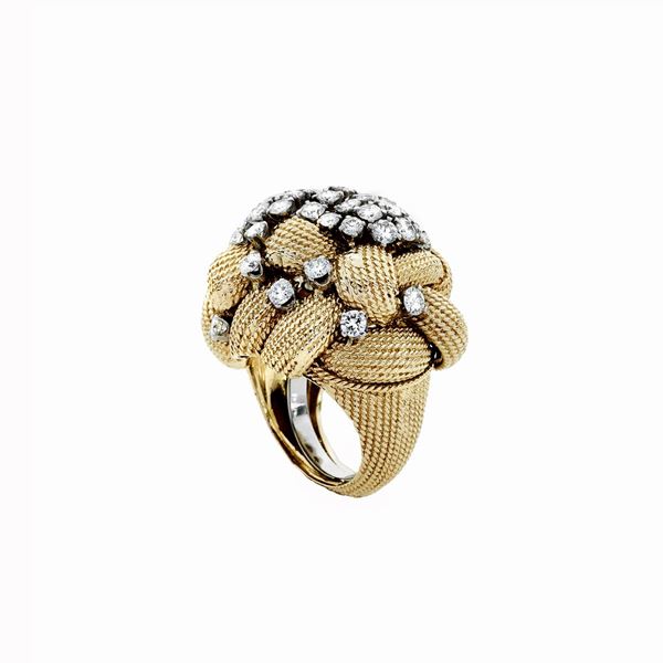 MATERIALE: oro giallo e diamanti DESCRIZIONE: anello realizzato come un nodi, in oro inciso ad imitazione del tessuto, impreziosito da diamanti taglio brillante MISURE: 6 PESO: diamanti ct 4,20, gr 28,7