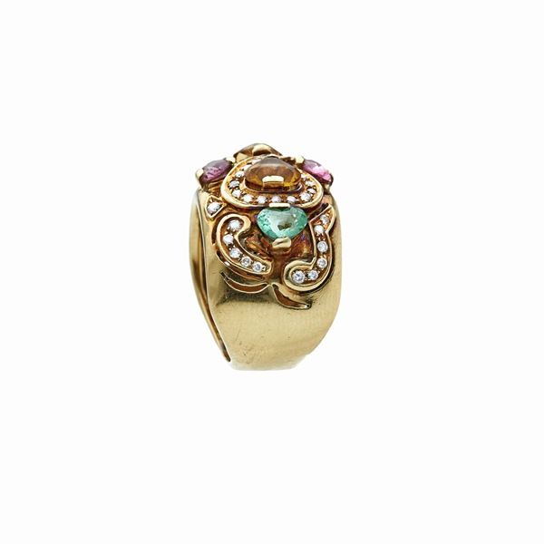 MATERIALE: oro giallo, diamanti, smeraldi, rubini e quarzi citrini DESCRIZIONE: anello a fascia leggermente bombata con al centro due quarzi citrini taglio goccia in una cornice intrecciata impreziosita con diamanti taglio brillante, ai lati rubini, smeraldi e brillanti, reca il marchio 750 MISURE: 16 PESO: gr 15,8