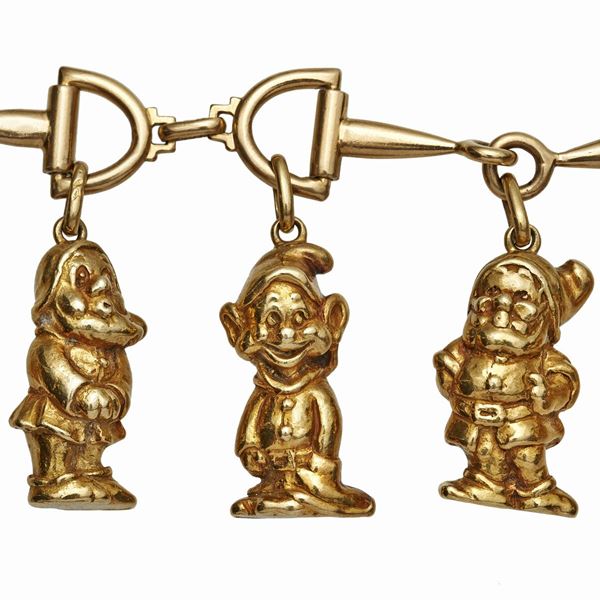 MATERIALE: oro giallo DESCRIZIONE: bracciale realizzato con maglie a morsetto, a cui sono stati applicati charms realizzati come i Sette Nani della favola di Walt Disney " Biancaneve e i sette nani", ognuno tridimensionale MISURE: lunghezza bracciale cm 20, ogni charm cm 3 PESO: gr 117,9