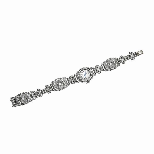 MATERIALE: in platino e diamanti DESCRIZIONE: bracciale-orologio con quadrante circolare, numeri arabi, lancette blu, ghiera e bracciale interamente impreziositi da diamanti taglio vecchio, bracciale a placche rettangolari ognuna centrata da maglia rettangolare con altre due arcuate per ciascun lato, alternate a maglie più piccole ottagonali, reca il marchio Platinum, un diamante mancante MISURE: lung cm 6,5 PESO: diamanti ct 6,50 circa, gr 29,4