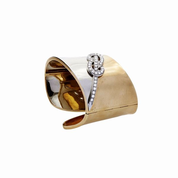 MATERIALE: oro giallo, oro bianco e diamanti DESCRIZIONE: alto bracciale rigido realizzato in due colori dell' oro e centrato da nodo interamente impreziosito da diamanti taglio brillante, parti laterali mobili MISURE: diametro interno cm 6 PESO: diamanti ct 2,50, gr 99