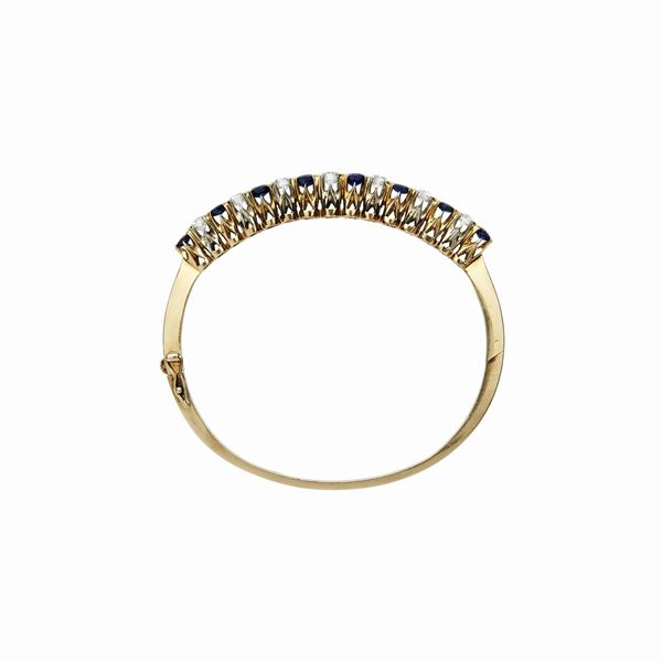 MATERIALE: oro giallo, oro bianco diamanti e zaffiri DESCRIZIONE: bracciale rigido con al centro sette diamanti taglio brillante alternati a zaffiri montati su alti castoni in oro giallo e bianco anch'essi alternati MISURE: diam interno cm 5,4 PESO: diamanti ct 1,50 circa, gr 23,1
