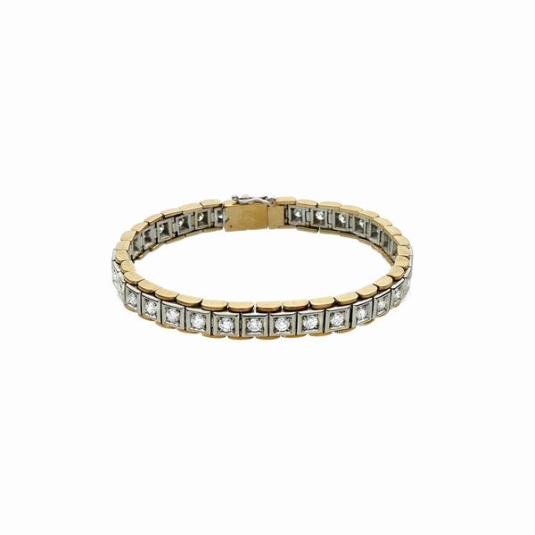 MATERIALE: oro bianco, oro giallo e diamanti DESCRIZIONE: bracciale realizzato con castoni quadrati ciascuno impreziosito da diamante taglio brillanti, fasce laterali ad arco in oro giallo, reca il marchio 750 MISURE: lung cm 18PESO: diamanti centrale ct 3,40 circa, gr 38