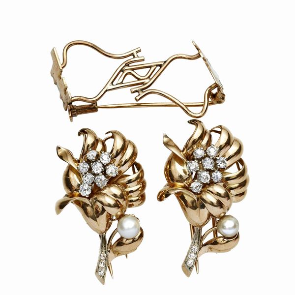 MATERIALE: oro giallo, oro bianco, diamanti e perla DESCRIZIONE: spilla realizzata come due fiori, ciascuno impreziosito al centro da otto diamanti taglio vecchio e perla, trasformabile in due clip MISURE: lung cm 5,8, ciascuna clip cm 4 PESO: diamanti ct 1,60, gr 26,3