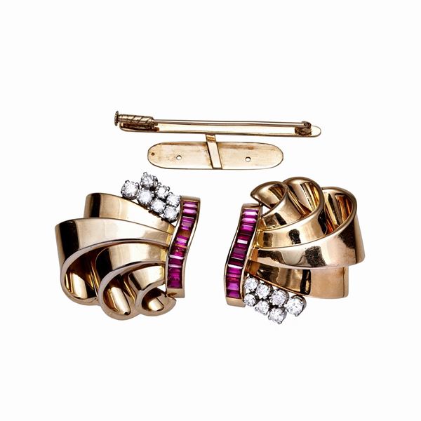 MATERIALE: in oro rosa, diamanti e pietre rosse DESCRIZIONE: spilla realizzata come un fiocco impreziosito al centro da due file di pietre taglio carrè con diamanti taglio brillante, trasformabile in due clip MISURE: cm 6x3 PESO: diamanti ct 1,40 circa, gr 28,6