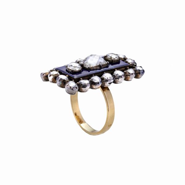 MATERIALE: oro giallo, oro a basso titolo, argento, smalto viola e diamanti DESCRIZIONE: anello a losanga con al centro grande rosa coronè tra due diamanti taglio vecchio su base impreziosita da smalto color viola, fascia interamente abbellita da rose di diamante, reca il marchio francese dell'oro MISURA: 13 PESO: diamante centrale ct 1,05, laterali 0,50, diamanti complessivi ct 3,40 gr 26,7