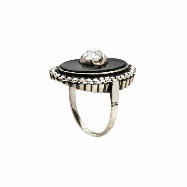 MATERIALE: oro bianco, onice, diamanti DESCRIZIONE: anello ovale centrato da diamante taglio vecchio su placca in onice, cornice esterna impreziosita da rose di diamanti, un diamante mancante MISURE: 13 PESO: diamante centrale ct 0,75, tot ct 1,45, gr 6