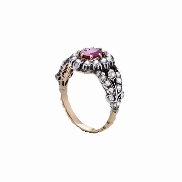 MATERIALE: oro giallo, argento, diamanti e rubino DESCRIZIONE: anello di ispirazione floreale, al centro un rubino taglio ovale incorniciato da diamanti taglio vecchio, ai lati motivi floreali abbelliti da rose di diamante, un diamante mancante MISURE: 17 PESO: rubino ct 0,50, diamanti ct 0,90