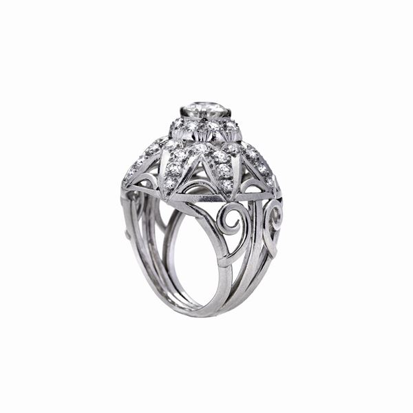 MATERIALE: oro bianco, diamanti DESCRIZIONE: anello a cupola impreziosito al centro da un diamante taglio brillante, corpo realizzato con foglie stilizzate abbellite da diamanti taglio brillante MISURE: 12 PESO: diamante centrale ct 0,80 circa, tot ct 1,80, gr 14,5