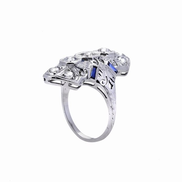 MATERIALE: platino, diamanti e zaffiri blu DESCRIZIONE: anello a losanga realizzato a tricot impreziosito al centro da tre diamanti taglio vecchio, su ciascun lato zaffiri taglio baguette e diamanti taglio vecchio, reca il marchio 18 kt MISURE: 15 PESO: zaffiri ct 0,20, tre diamanti centrali ct 0,80 circa, totali ct 1,4 gr 5,6