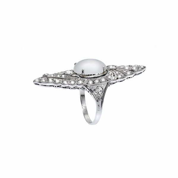 MATERIALE: oro bianco, pietra di luna e diamanti DESCRIZIONE: anello a losanga, realizzato con pietra di luna taglio cabochon tra due diamanti taglio brillante, su base allungata interamente impreziosita da diamanti taglio brillante MISURE: 16 PESO: diamanti ct 1,0 circa, gr 11,1