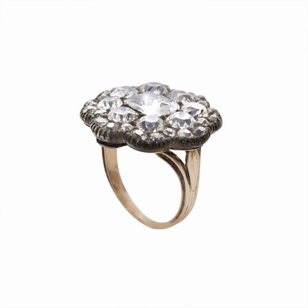 MATERIALE: oro giallo, argento e diamanti DESCRIZIONE: anello realizzato come un fiore con al centro diamante taglio vecchio incorniciato da due fasce impreziosite con diamanti taglio vecchio MISURE: 11 PESO: diamant centrale ct 1,70, diamanti ct 3,70, gr 8,4