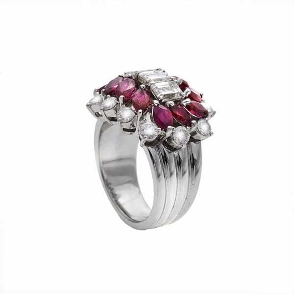 MATERIALE: oro bianco, diamanti e rubini DESCRIZIONE: anello realizzato con al centro tre diamanti taglio smeraldo incorniciati da rubini taglio navette e da diamanti taglio brillante, reca il marchio 750 MISURE: 11 PESO: diamanti ct 2,20 complessivi, rubini ct 2,50, gr 11,7