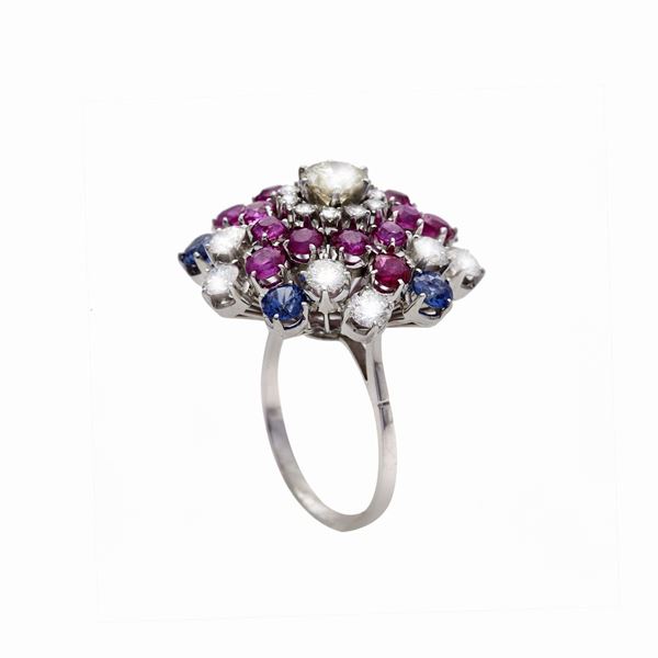 MATERIALE: oro bianco, diamanti, rubini e zaffiri chiari DESCRIZIONE: anello di ispirazione floreale con al centro diamante taglio brillante impreziosito da rubini, zaffiri e diamanti taglio brillante MISURE: 16 PESO: diamante centrale ct 0,65, diamanti ct 1,00, gr 9,4