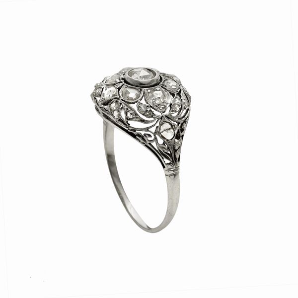 MATERIALE: oro bianco e diamanti DESCRIZIONE:anello bombato, realizzato a tricot ed impreziosito da rose di diamante MISURE: 23 PESO: diamanti ct 0,50, 3,8 gr