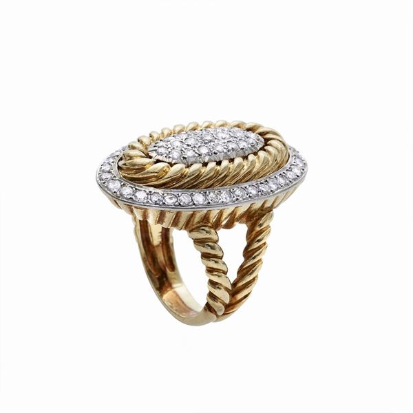 MATERIALE: oro giallo, diamanti DESCRIZIONE: anello a losanga interamente impreziosito da pavè di brillanti, su alta base baccellata, reca il marchio 18K MISURE:18 PESO: ct diamanti 1,60, gr 22,2