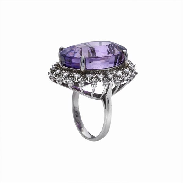 MATERIALE: oro bianco 14K, ametista e diamanti DESCRIZIONE:anello di forma ovale con al centro grande ametista sfaccettata, impreziosita da doppia fila di diamanti taglio brillante, reca il marchio 14K MISURE: 14 PESO: ct diamanti 1,20, gr 12,5