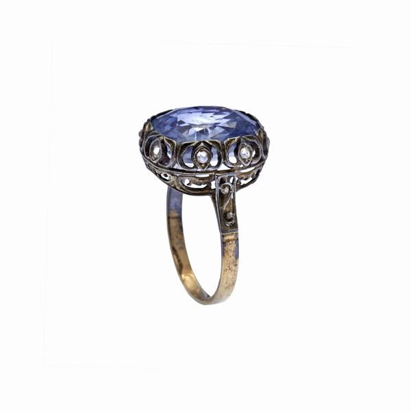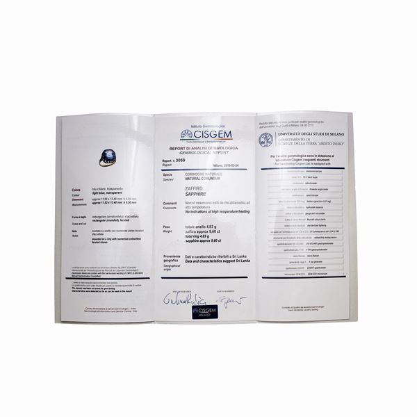 MATERIALE: oro a basso titolo, argento, diamanti e zaffiro chiaro DESCRIZIONE:anello realizzato con al centro grande zaffiro chiaro di taglio rettangolare sfaccettato appoggiato su cuscino di volute contrapposte centrate da rose di diamanti, corredato di certificato Cisgem n 3059 MISURE: 14 PESO: zaffiro chiaro, Sri Lanka ct 9,60, non presenta trattamenti da riscaldamento ad alta temperatura, gr 4,9