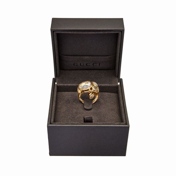 MATERIALE: oro giallo satinato e quarzo DESCRIZIONE: anello realizzato con quarzi di varie forme taglio briolette disposti in maniera irregolare, un quarzo pendente, firmato Gucci, reca il marchio 750 e 18 kt, corredato di scatola originale MISURE: 8 PESO: gr 11,3
