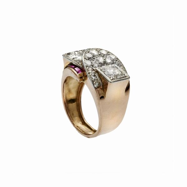 MATERIALE: oro rosa, oro bianco, rubini e diamanti DESCRIZIONE: anello realizzato come una fibbia stilizzata interamente impreziosito da diamanti taglio vecchio e rubini ai lati MISURE: 17 PESO: diamanti più grande ct 0,80, colore H, purezza I1 altri due ct 1,20 complessivi, colore H, purezza I1, diamanti pavè ct 0,45, gr 9,8
