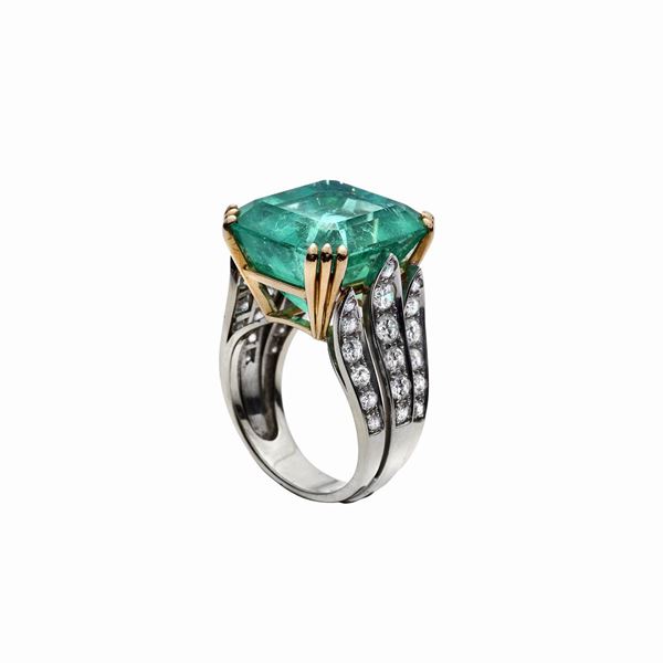 MATERIALE: oro bianco, oro giallo, diamanti e smeraldo DESCRIZIONE: importante anello realizzato con al centro grande smeraldo naturale taglio quadrato impreziosito da diamanti taglio brillante che abbelliscono le parti laterali, reca il marchio 750, corredato di rapporto gemmologico MISURE: 15 PESO: smeraldo naturale ct 23,00, diamanti ct 1,90, colore G, purezza VS, gr 15,3