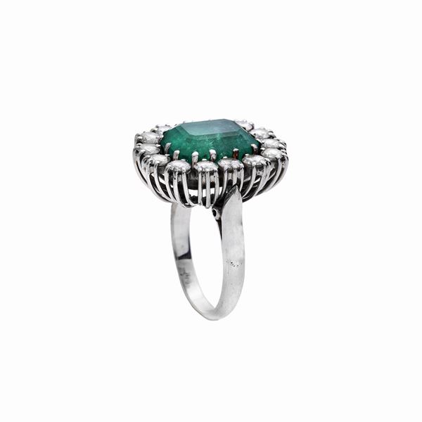 MATERIALE: oro bianco, diamanti e smeraldo DESCRIZIONE: anello realizzato con al centro smeraldo taglio ottagonale incorniciato da diamanti taglio brillante MISURE: 12 PESO: smeraldo ct 6,00, diamanti ct 1,40, gr 9,9