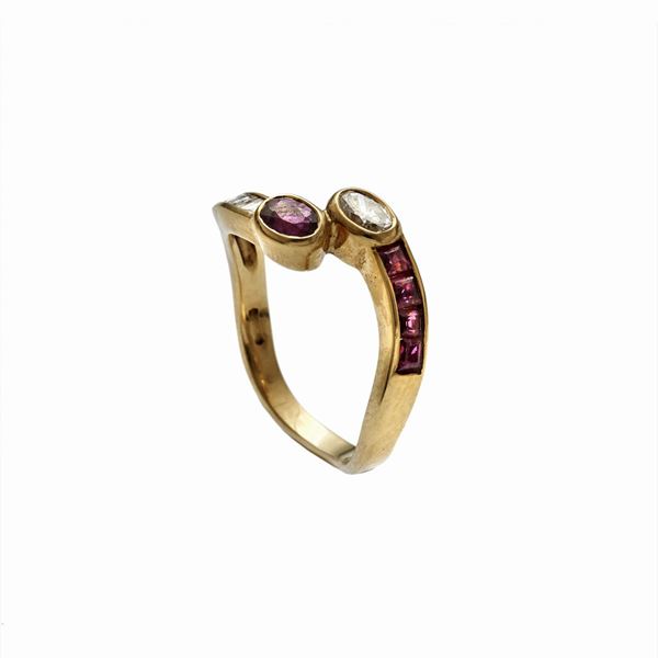 MATERIALE: oro giallo, diamanti e rubini DESCRIZIONE: anello contrariè con al centro diamante e rubino taglio ovale impreziositi ai lati da diamanti e rubini di taglio carrè, reca il marchio 750 MISURE: 15 PESO: diamante ovale ct 0,30, rubino ovale ct 0,25, diamanti ct 0,28, rubini ct 0,30 gr 4,2