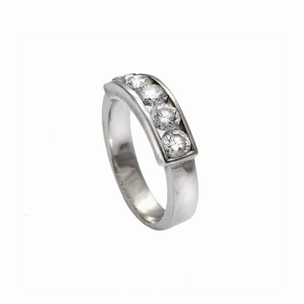 MATERIALE: oro bianco e diamanti DESCRIZIONE: anello riviere con cinque diamanti taglio brillante MISURE: 14 PESO: diamanti ct 1,40, Colore F-H, purezza VVS-VS, gr 6,2