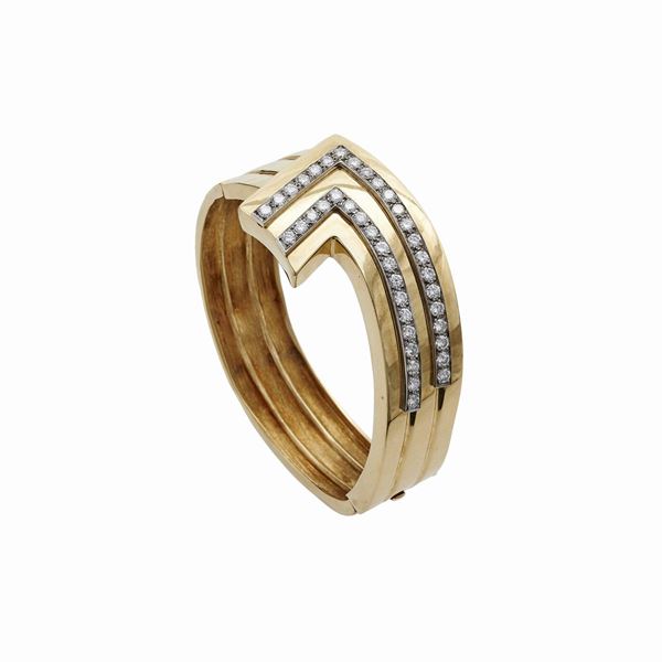 MATERIALE: oro giallo e diamanti DESCRIZIONE: bracciale rigido realizzato come una freccia stilizzata, impreziosito da due file di diamanti taglio brillante, reca il marchio 18K MISURE: diam cm 5,5 PESO:ct diamanti 2, 0 Colore H, purezza VVS, gr 67,4